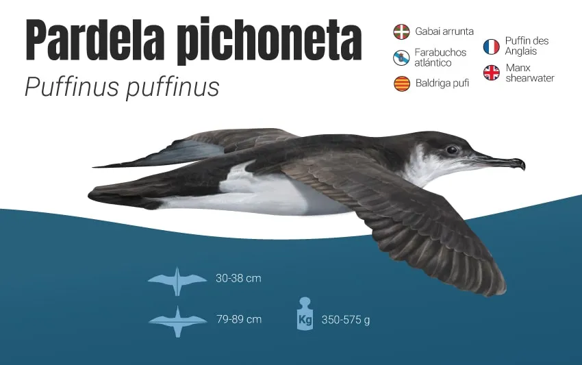 La infografía de la pardela pichoneta forma parte de una serie realizada dentro del proyecto EVALRENAT, con el apoyo de la Fundación Biodiversidad, y parten de las fichas técnicas sobre especies marinas en peligro, vulnerables, amenazadas o protegidas de la Demarcación Noratlántica.