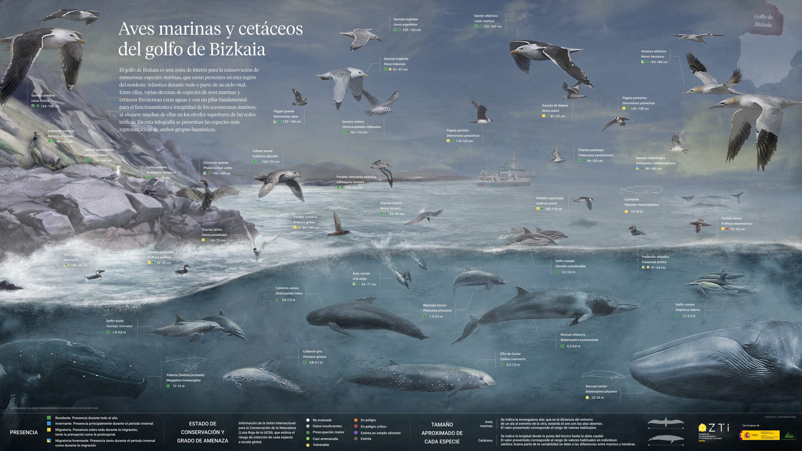 En el marco del proyecto “EVALRENAT – Evaluación espacial de la red Natura 2000 para la conservación de especies de interés comunitario en la Demarcación Noratlántica”, financiado en la convocatoria 2019 de Conservación de la Biodiversidad Marina de Fundación Biodiversidad, del Ministerio para la Transición Ecológica y el Reto Demográfico, se ha realizado una infografía para mostrar las especies más representativas de ambos grupos faunísticos. La realización de la infografía, obra de José Miguel Mayo, ha sido posible gracias al trabajo de personal investigador de diversas áreas de AZTI, que ha ideado y elaborado los contenidos.