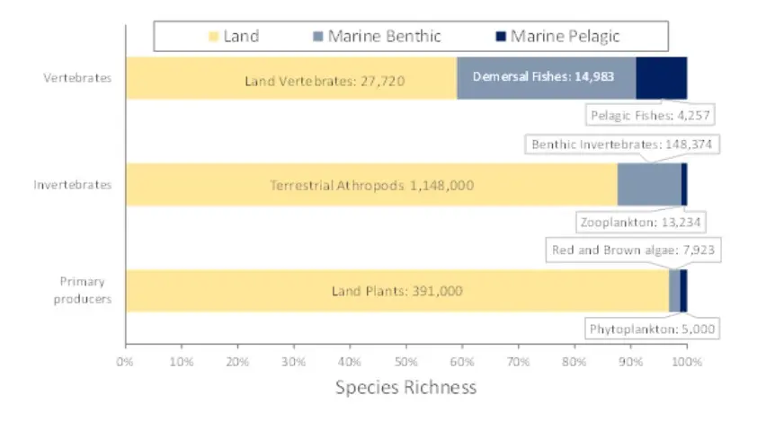 En resumen, las diferencias más acusadas en riqueza de especies entre el medio marino y el terrestre se encuentran en los productores primarios y los invertebrados, especialmente al comparar el bentos iluminado con el dominio pelágico. La estructura física del entorno es, por tanto, clave para entender estos patrones de diversidad.