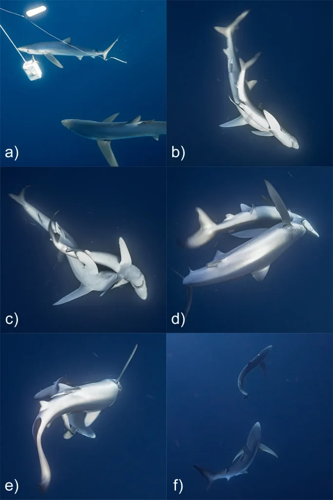 El registro visual muestra una secuencia de comportamientos compatibles con el cortejo en tiburones: nado en paralelo entre macho y hembra, seguimiento, una mordida en la aleta pectoral y la inversión de ambos ejemplares en el agua. La interacción duró algo más de cuatro minutos y no culminó en cópula, ya que la hembra logró zafarse y abandonar la zona.