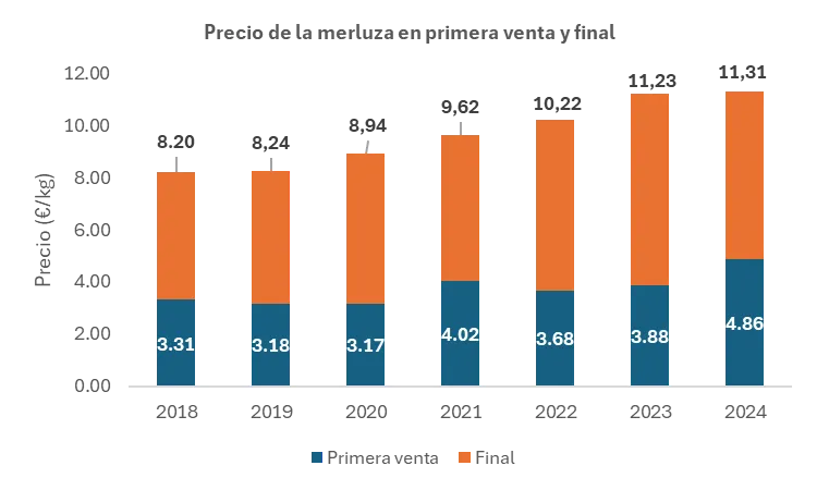 Consumer prices in the Basque Country have shown an almost constant upward trend, rising from €6.7/kg in 1999 to €11.3/kg in 2024. In contrast, the prices received by our arrantzales (fishers) have not followed such a consistent pattern. Between 2018 and 2024, their average hake landings were 3,550 tonnes. Yet in 2023, although catches were 40% lower than in 2018, first-sale prices increased by only 17%.