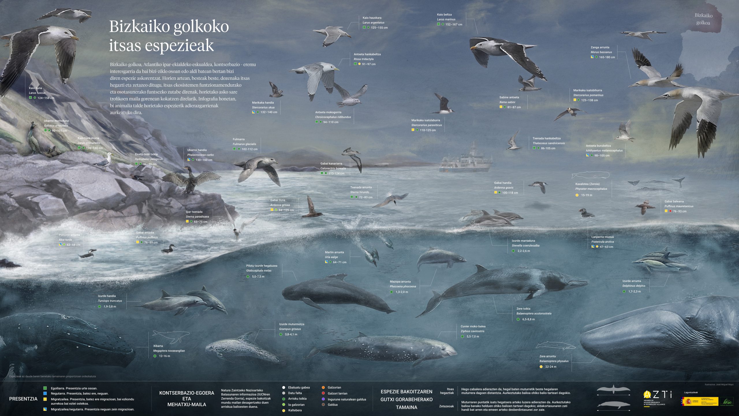 “EVALRENAT – Natura 2000 sarearen ebaluazio espaziala, interes komunitarioko espezieen kontserbaziorako Ipar Atlantikoko Demarkazioan” proiektuaren baitan, espezie adierazgarrienak erakusten dituen infografia bat egin da, bai itsas hegaztiei bai zetazeoei buruzkoa. Proiektua Biodibertsitatearen Kontserbaziorako 2019ko deialdiaren barruan finantzatu zuen Biodibertsitatearen Fundazioak, Trantsizio Ekologikorako eta Erronka Demografikorako Ministerioaren bidez.