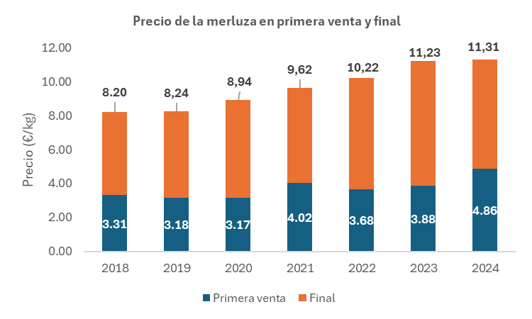 La diferencia entre ambos precios está determinada principalmente por el precio de primera venta; a menor precio de origen, mayor será la diferencia entre ambos valores, mientras que, al incrementarse el precio de primera venta, dicha variación se reduce. Adicionalmente, el nivel de consumo de merluza influye en esta diferencia; cuando el consumo disminuye, la disparidad entre los precios tiende a incrementarse.